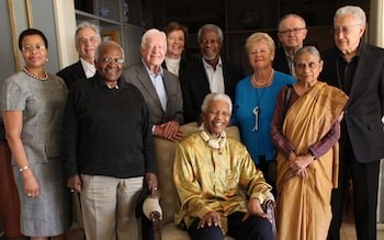 Nelson Mandela, seated, is reunited with the original Elders line-up in 2010 (from left: Graca Machel, Fernando Henrique Cardoso, Desmond Tutu, Jimmy Carter, Mary Robinson, Kofi Annan, Gro Brundtland, Martti Ahtisaari, Ela Bhatt, Lakhdar Brahimi) Credit: Getty